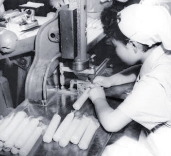 魚肉ソーセージの起源は1930年代まで遡るとされていますが、急速な成長が始まったのは戦後の1953年頃からです。当時の魚肉ソーセージは、定量の魚肉をケーシングに充填し、端を紐で強く縛るという方法で生産されていました。しかし、これでは隙間から空気や水が入ってしまいます。クレハは思い切って発想を変え、ソーセージ生産の隘路となっていた結紮作業の機械化に取り組みました。結紮工程の改革でソーセージの生産性は飛躍的に向上し、結果、<クレハロンフィルム>の市場開拓が大きく前進したのです。