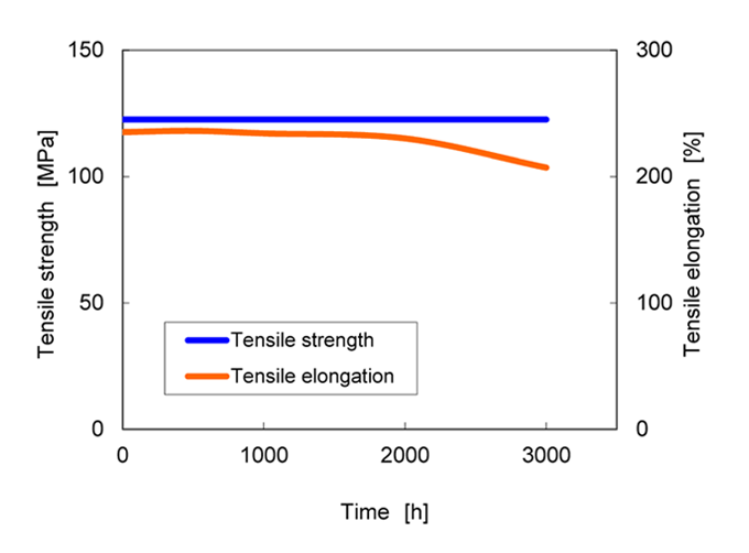 Weatherability test - tensile strength and elongation Exposure condition: Weatherometer, Carbon-arc lamps,