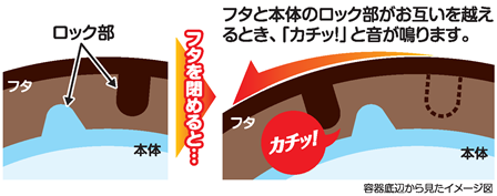 フタと本体の間に隙間ができると液漏れが起こりやすくなりますが、「カチッとロック」はフタの凸部が変形してパッキンのようになり、隙間をなくすことで液漏れを低減することができます。